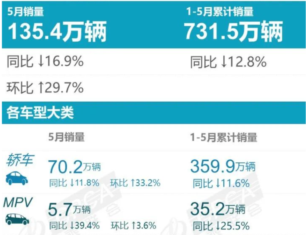 6月10日乘聯(lián)會(huì)的最新數(shù)據(jù)顯示,5月國產(chǎn)狹義乘用車零售銷量回升至135.4萬輛,環(huán)比增長29.7%,同比跌幅也收窄至16.9%。